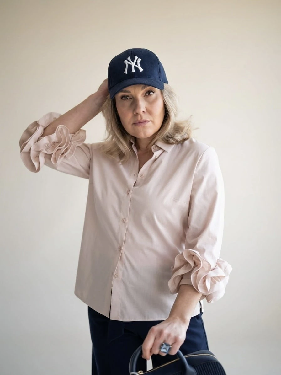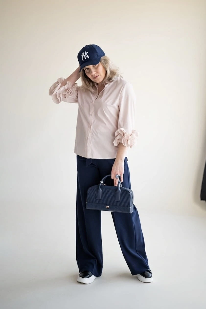 Przepiękna damska koszula w kolorze różowo-beżowym z ozdobnymi rękawami urozmaici niejedną stylizację.
